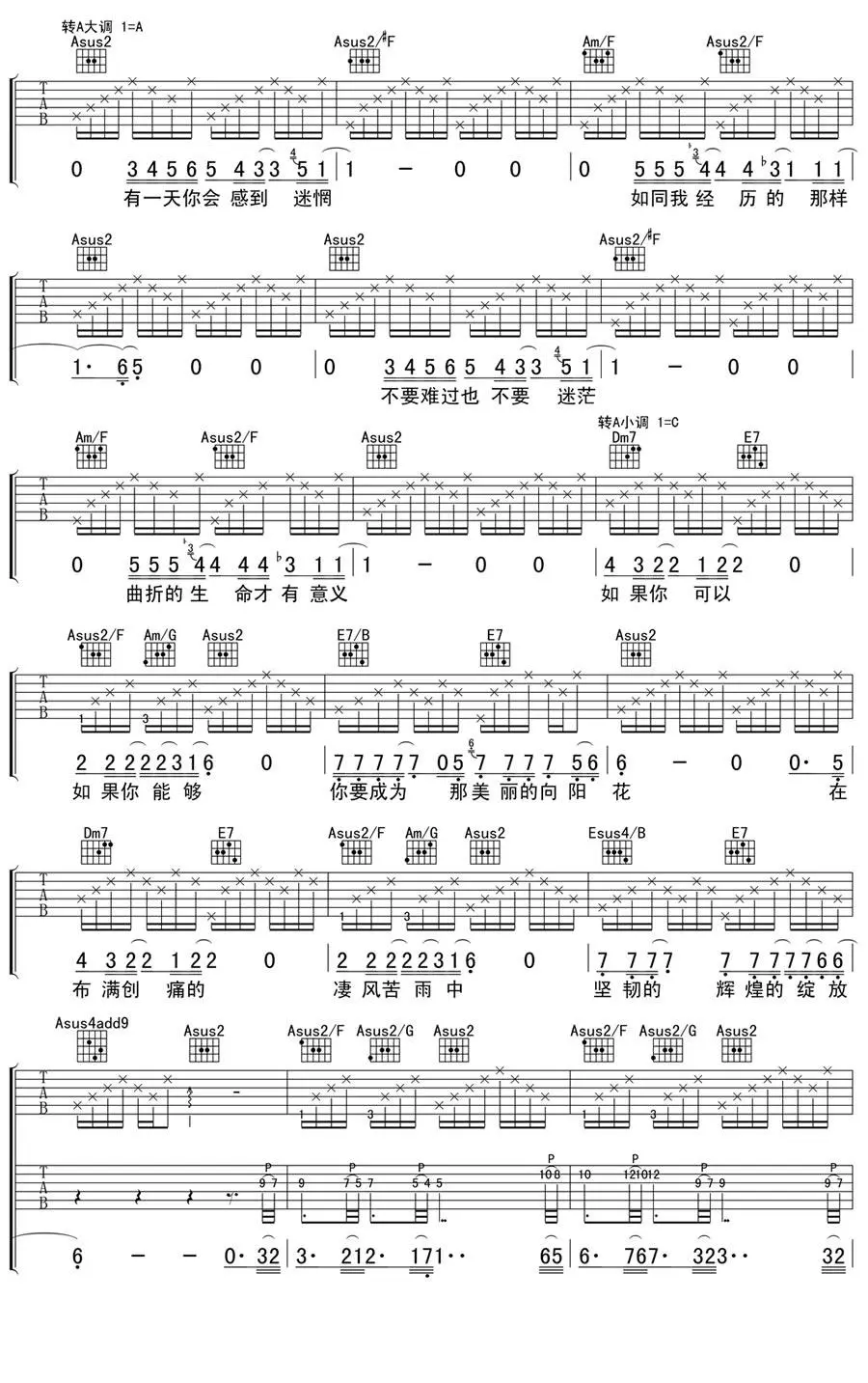 《向阳花》吉他谱_汪峰_A调指法_弹唱谱_完整版高清图片谱_六线谱_给女儿的歌