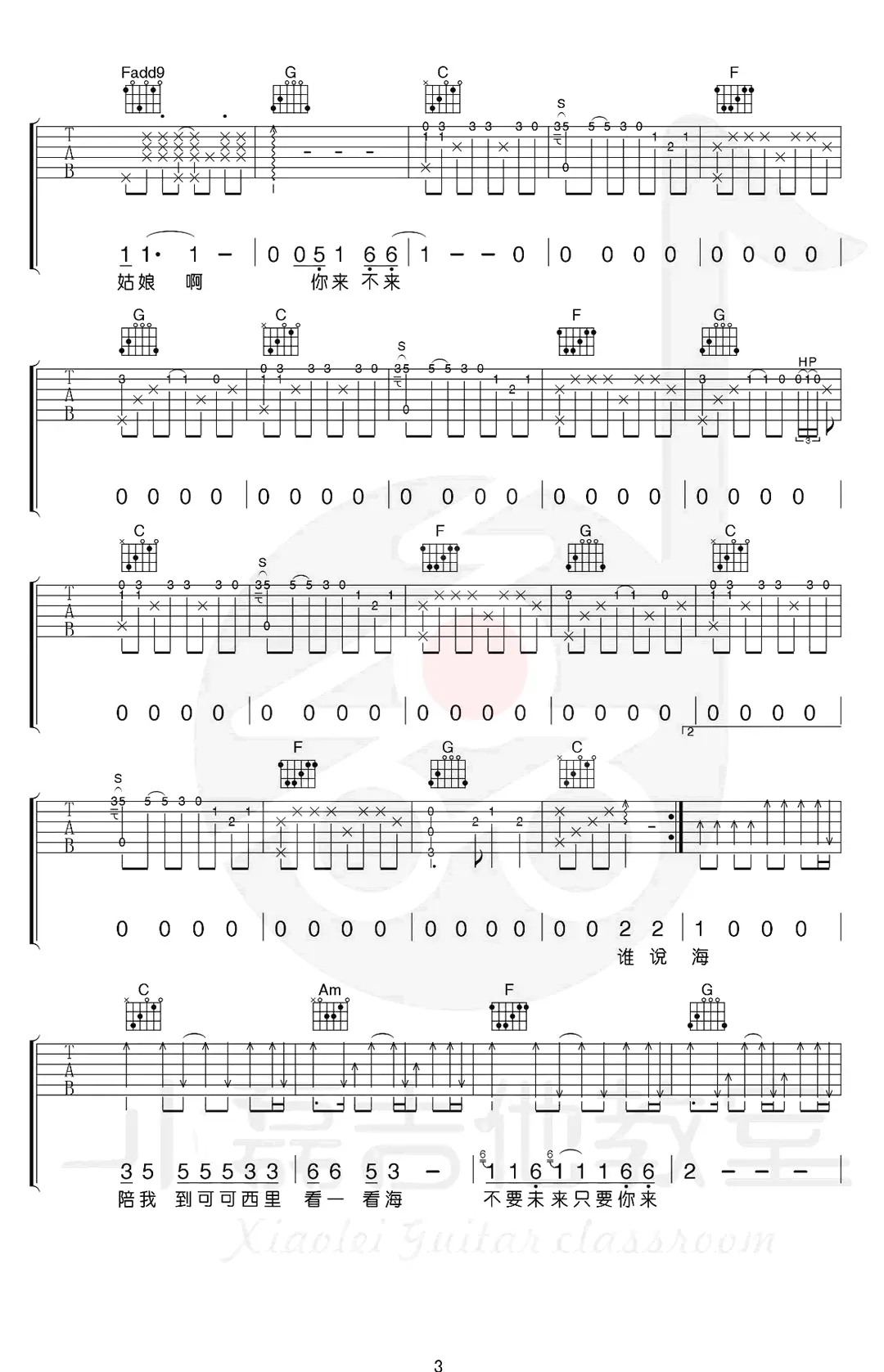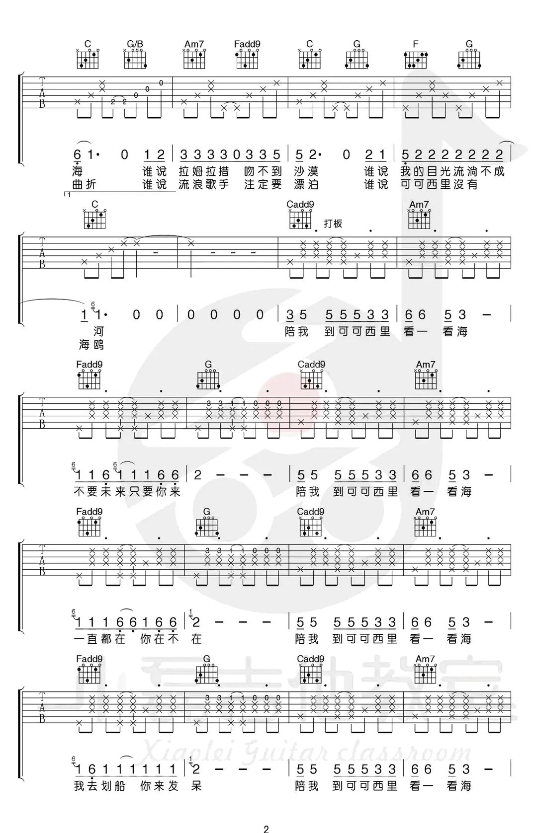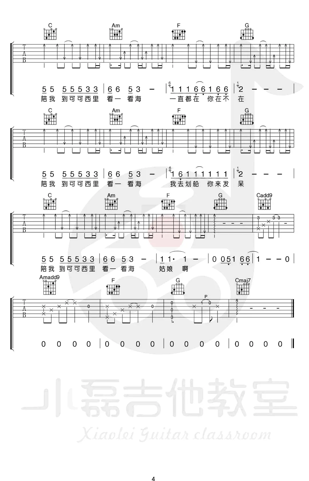 《陪我到可可西里去看海》吉他谱,大冰作词作曲及演唱的一首代表民谣歌曲,收录在2015年发行的专辑《大冰的小屋》中。歌曲原调#F,吉他谱选用C调指法编配,由小磊吉他编配出品。