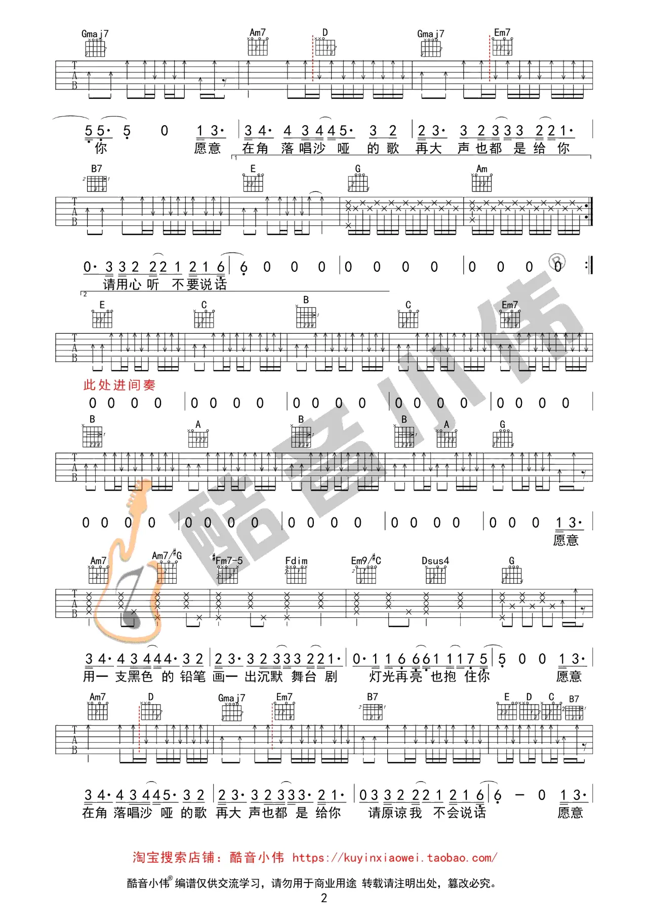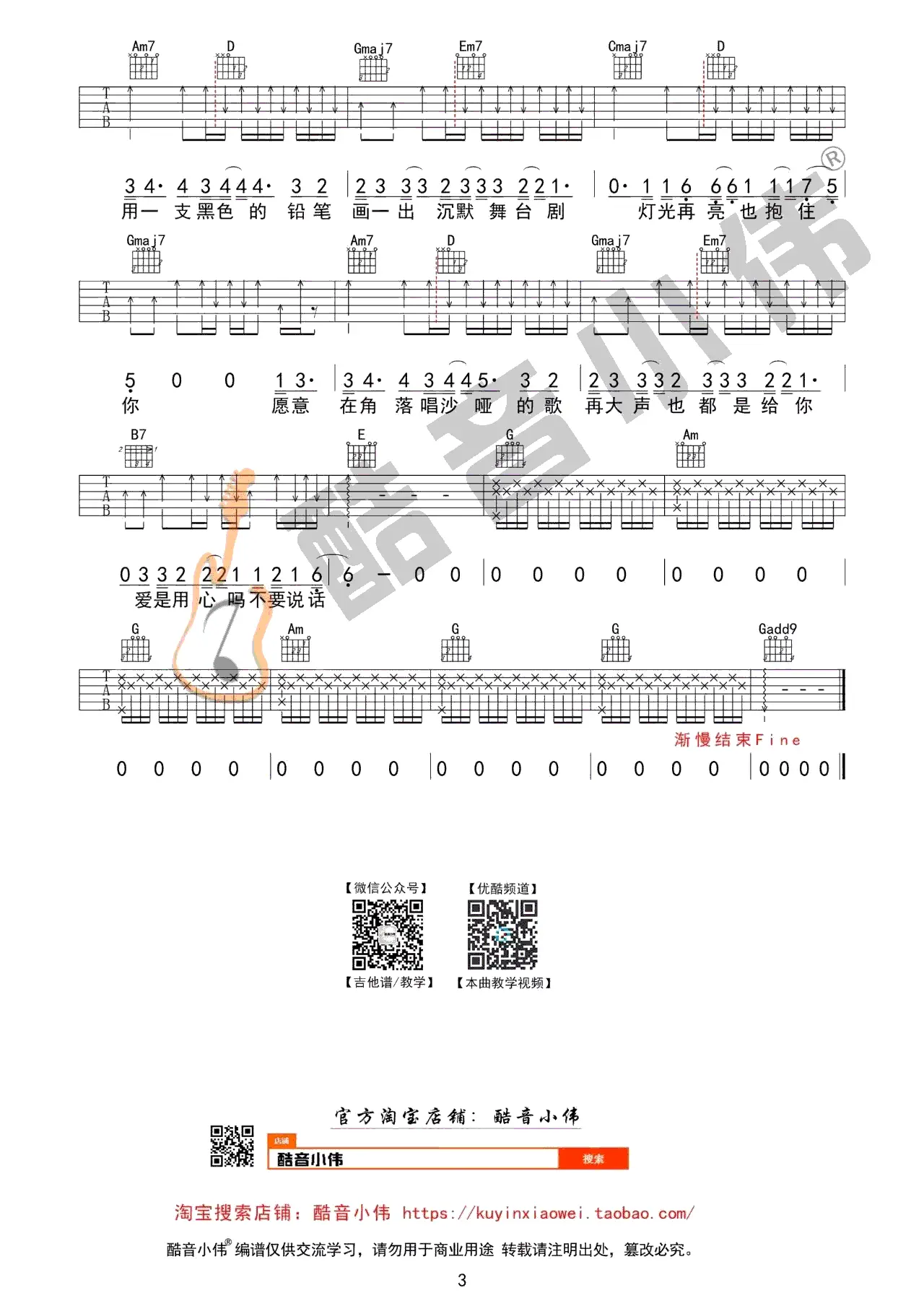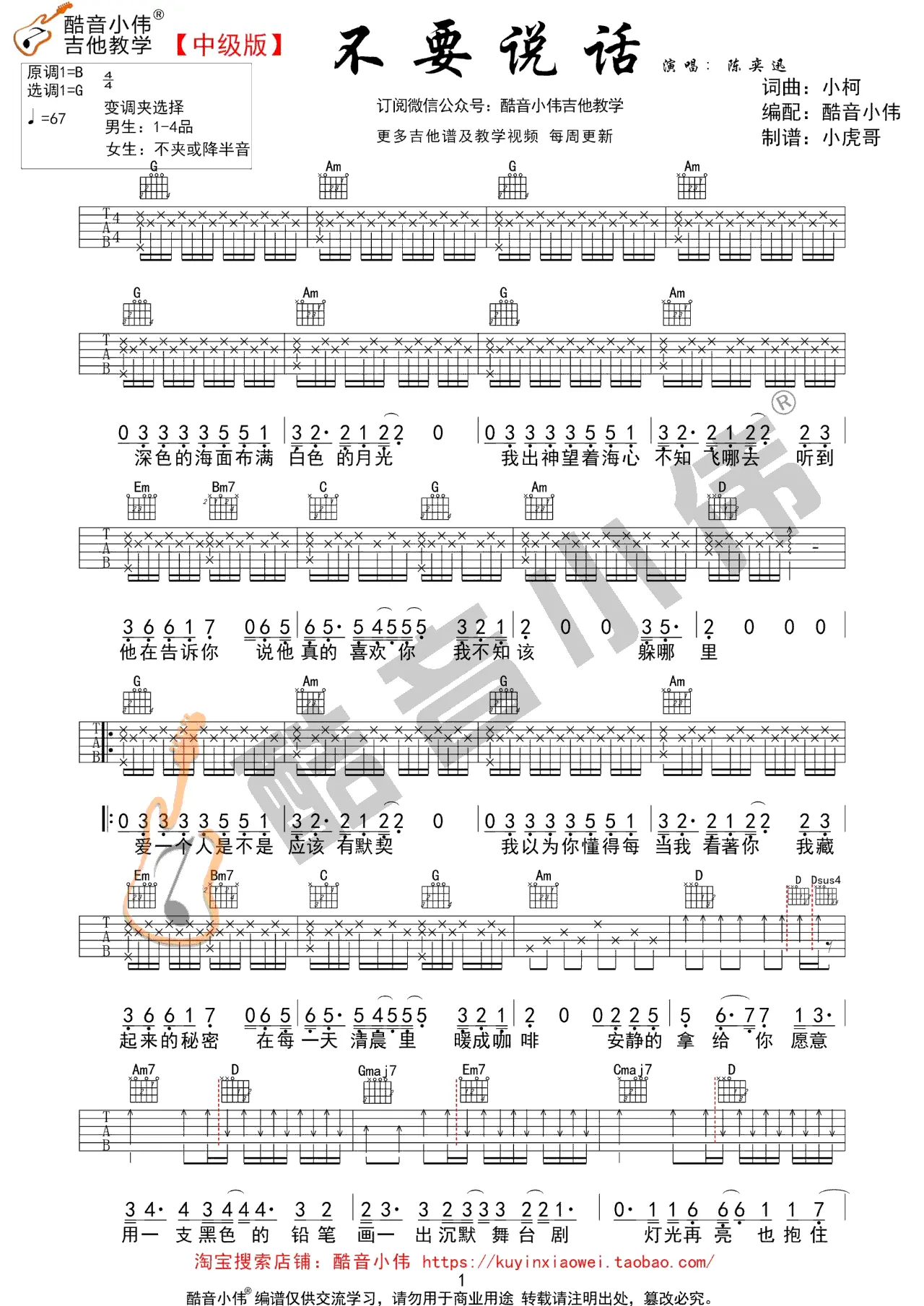 不要说话吉他谱,陈奕迅演唱的一首歌曲,由小柯作词作曲,收录于2008年发行的专辑《不想放手》中。吉他谱选用G调指法编配,变调夹夹1-4品,共3张高清图片谱,由酷音小伟编配出品。