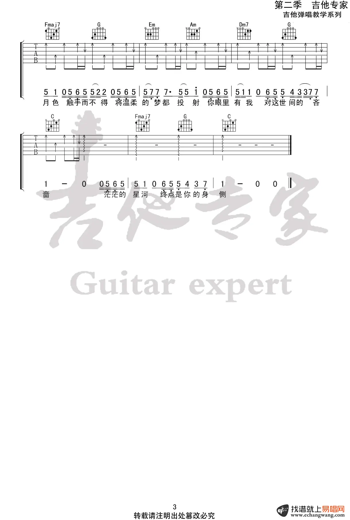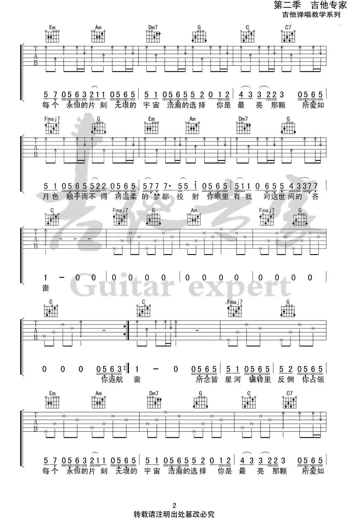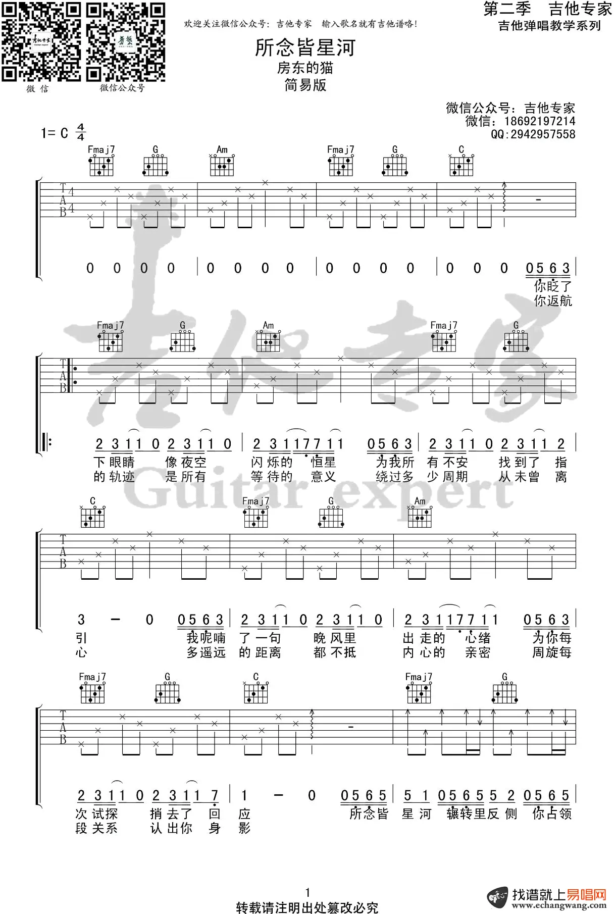 《所念皆星河》吉他谱,房东的猫演唱的一首歌,由镜千作词,CMJ作曲,收录在2020年发行的专辑《所念皆星河》中。 吉他谱选用C调指法编配,演奏难度简单。