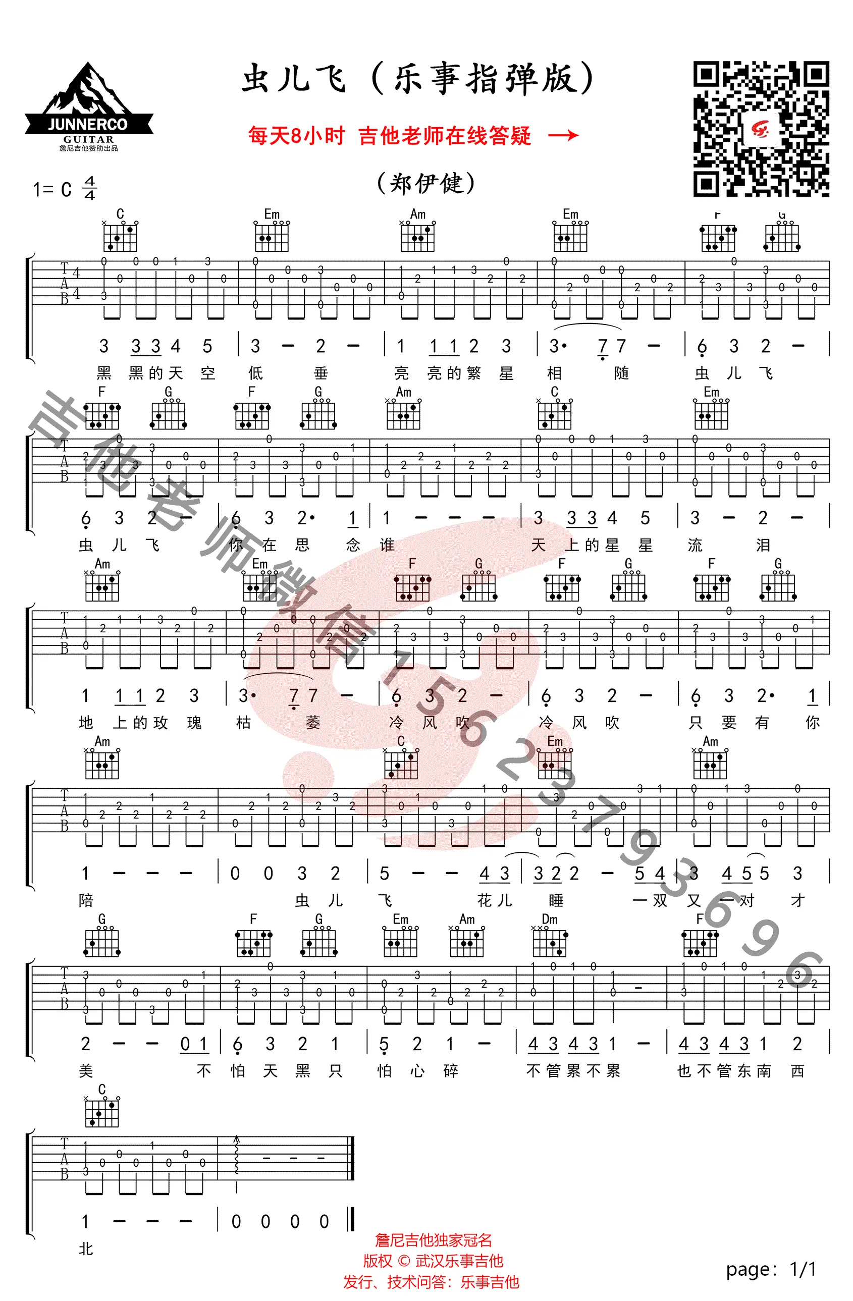 虫儿飞指弹谱_郑伊健_C调_新手必学_吉他独奏谱_图片谱