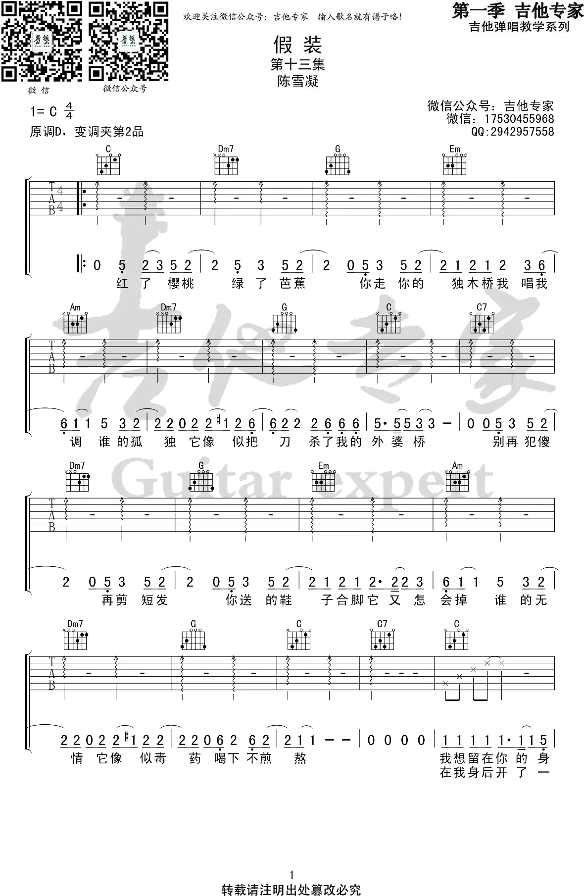 《假装》吉他谱,陈雪凝作词、作曲并演唱,收录于2018年发行的专辑《拾陆》中,抖音热门伤感情歌。歌曲原调D,吉他谱选调C,capo夹2品为原调,共4张高清图片谱,由吉他专家编配出品。