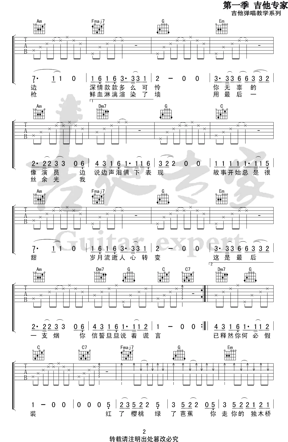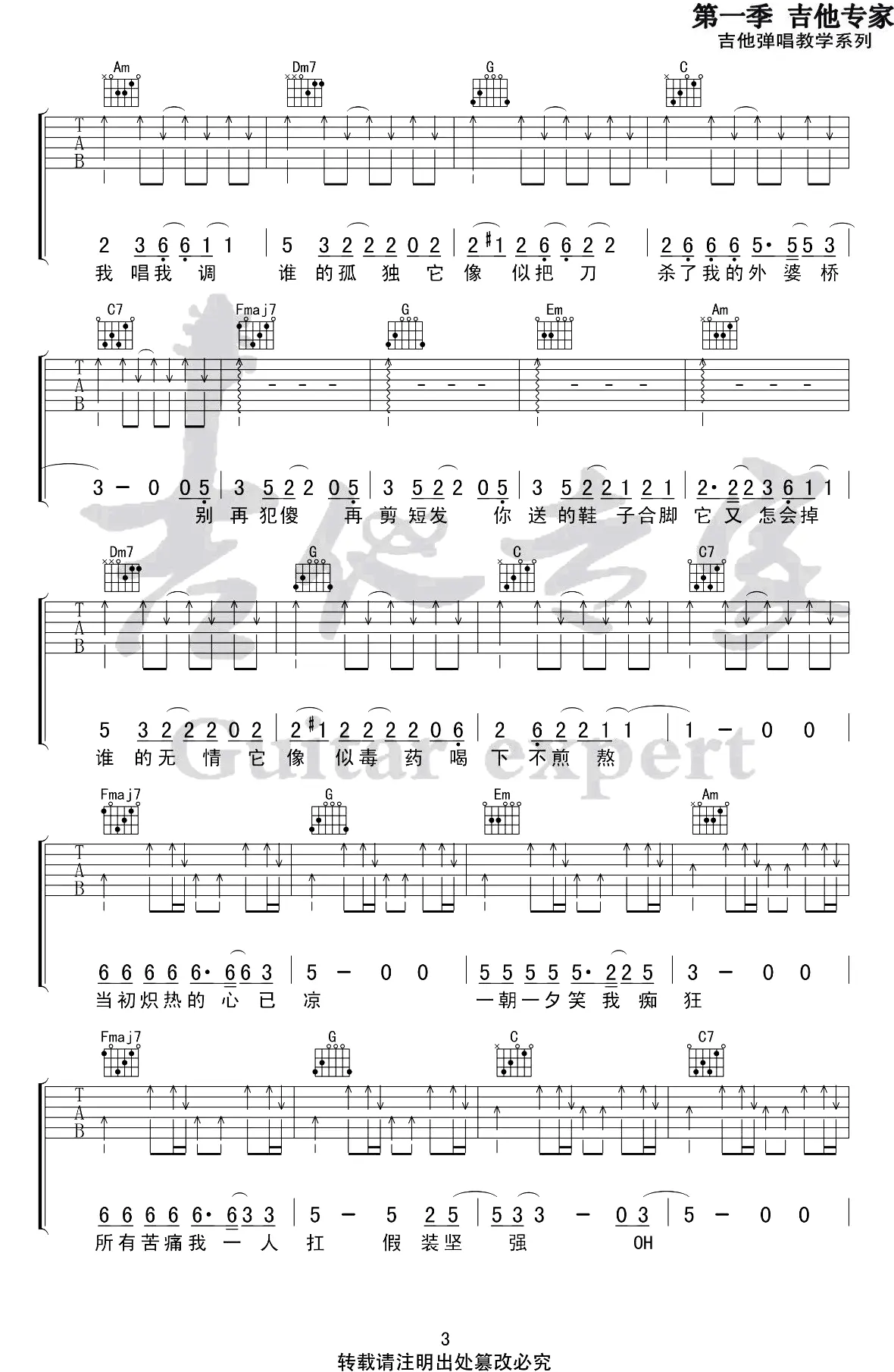 《青春舞曲》指弹谱_新疆歌曲_C调指法_六线谱_初级练习曲