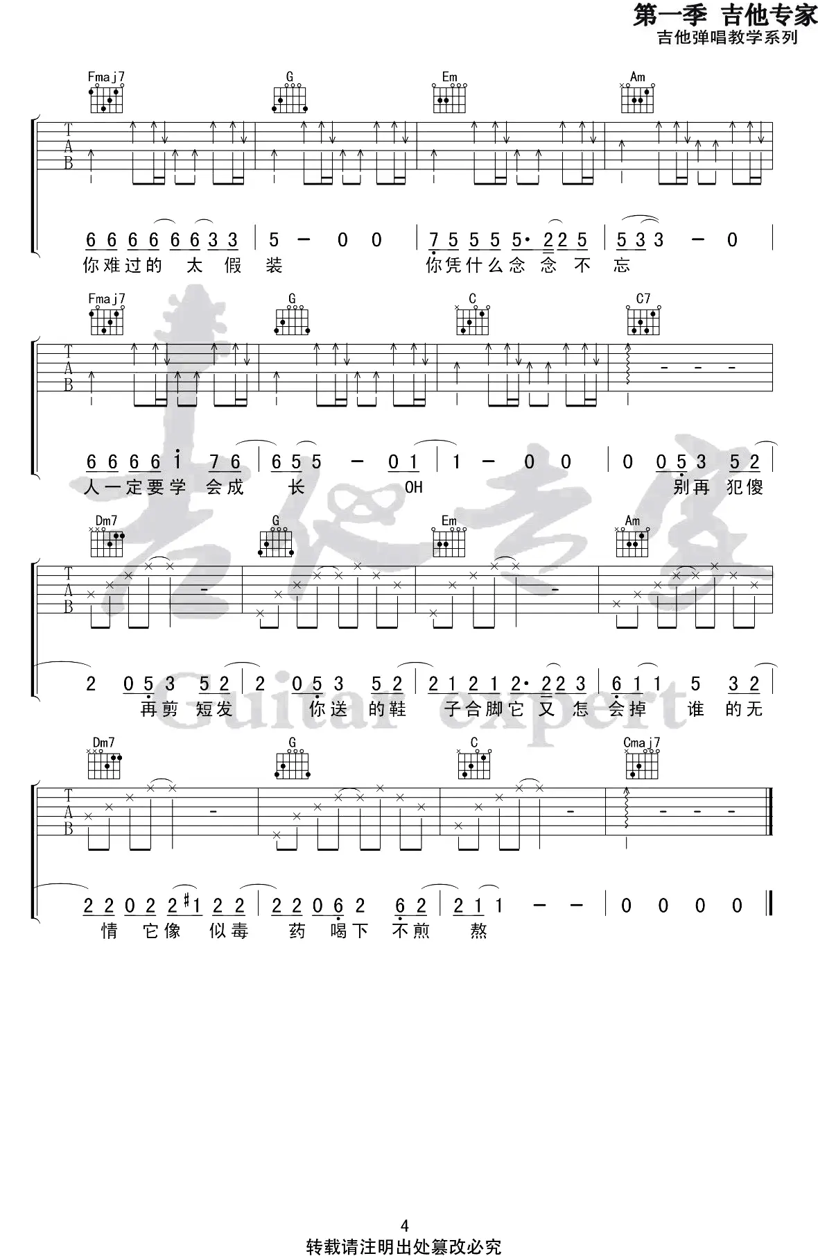 《假装》吉他谱_陈雪凝_六线谱_高清图片谱_C调_抖音歌曲