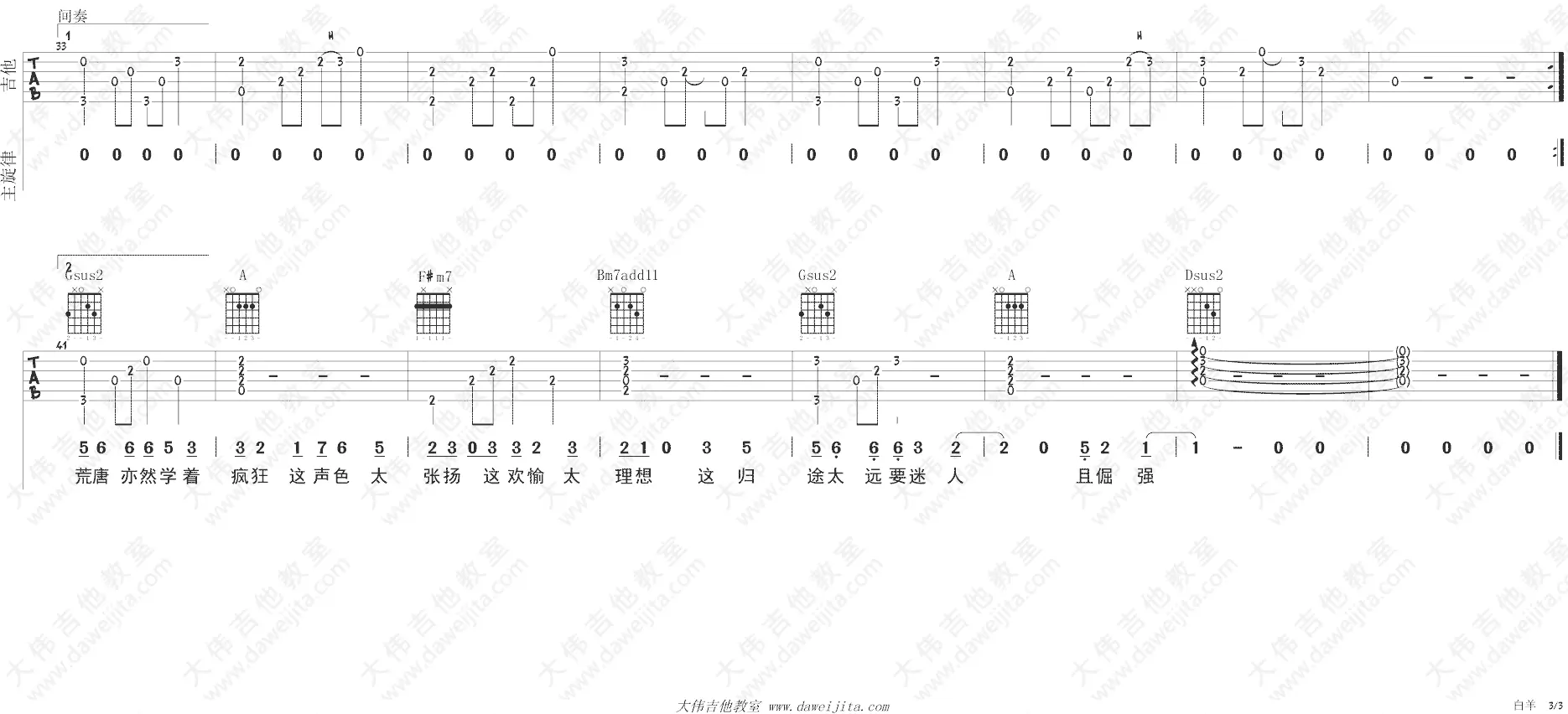 白羊吉他谱_徐秉龙_D调指法_图片版六线谱
