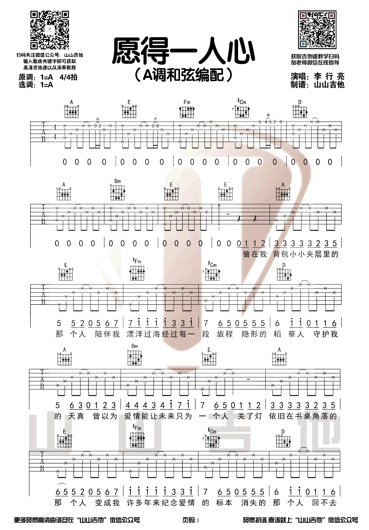 《愿得一人心》吉他谱,李行亮演唱,胡小健作词,罗俊霖作曲,收录在2012年发行的专辑《愿得一人心》中。吉他谱选用A调指法编配,共2张图片谱,由山山吉他编配出品。