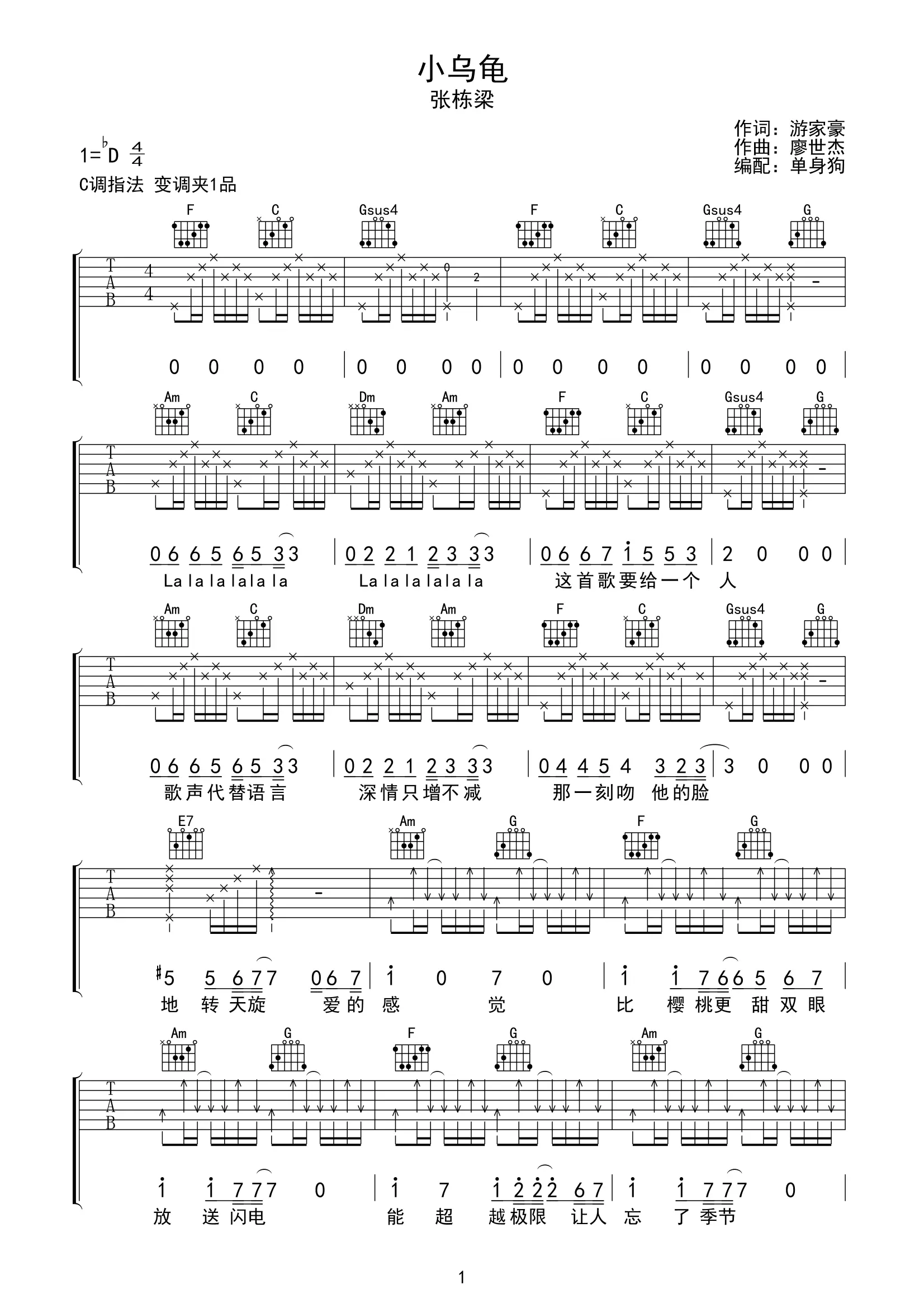 《小乌龟》吉他谱,张栋梁演唱的一首歌,由游家豪作词,廖世杰作曲,收录于2006年发行的专辑《微笑Pasta》电视剧原声带中,这首歌是台湾偶像剧《微笑Pasta》的主题曲。歌曲原调bD,吉他谱选用C调指法编配,变调夹夹1品为原调,演奏难度简单,共3张高清图片谱。
