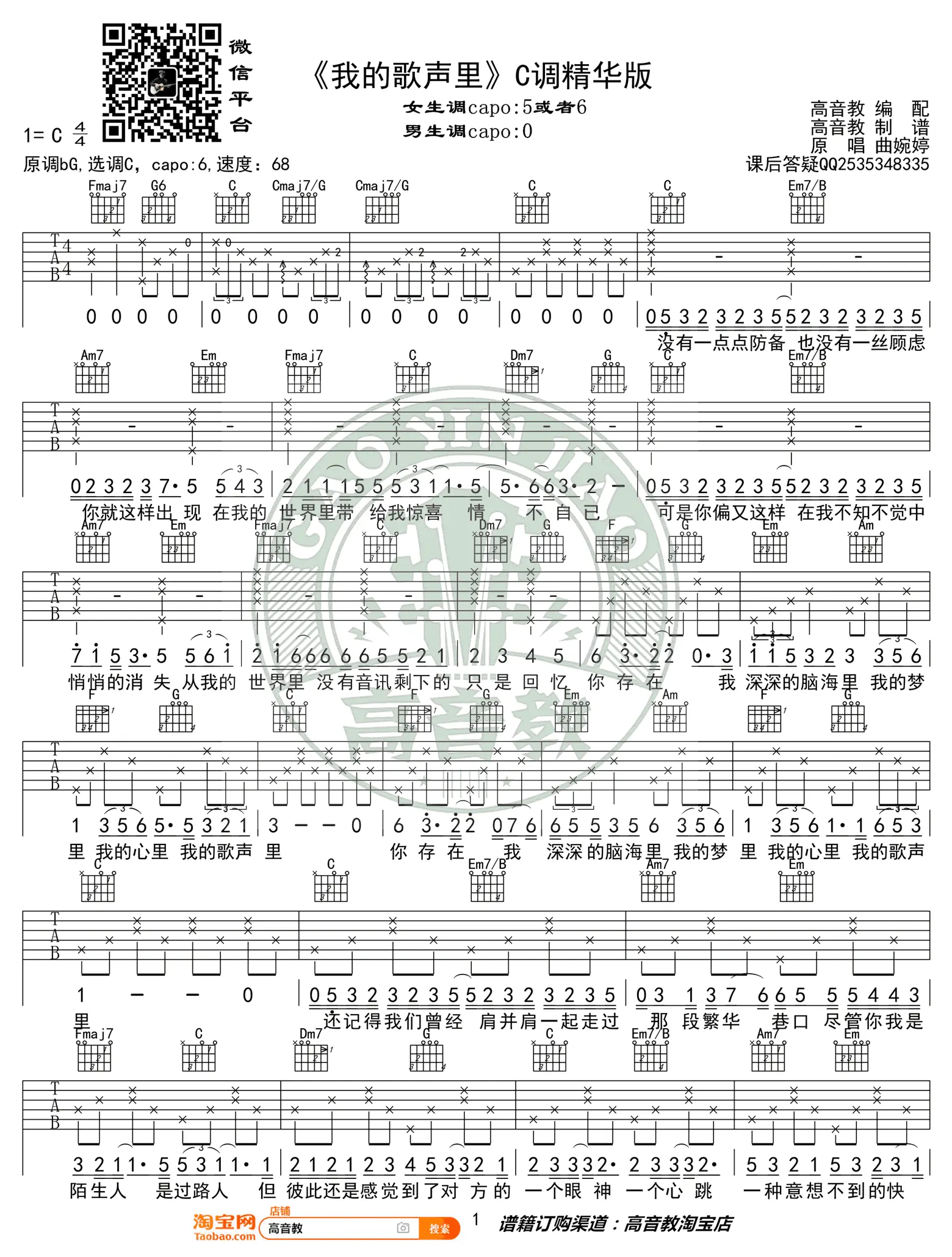 《我的歌声里》吉他谱,曲婉婷创作及演唱的一首抒情歌曲,收录于2012年发行的专辑《我的歌声里》中。 歌曲原调Gb,吉他谱选调C调,变调夹夹6品,由高音教编配出品。